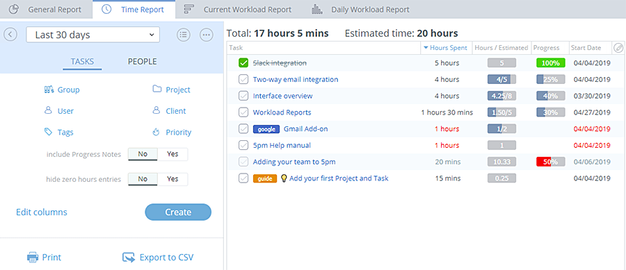 5pm offers a selection of customizable reports that can help you filter your data in various ways, track time spent on tasks or visualize your team's workload.